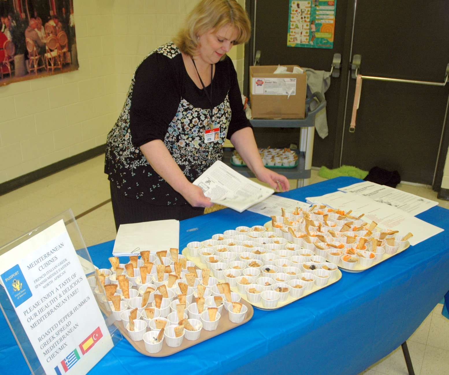 A Greek spread and a roasted pepper hummus spread were served with Pita slices. Students also tasted a special Mediterranean Chex mix.