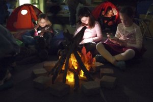 Students and parents read by flashlight around campfires while other students chose to read by flashlight inside tents set up in classrooms.
