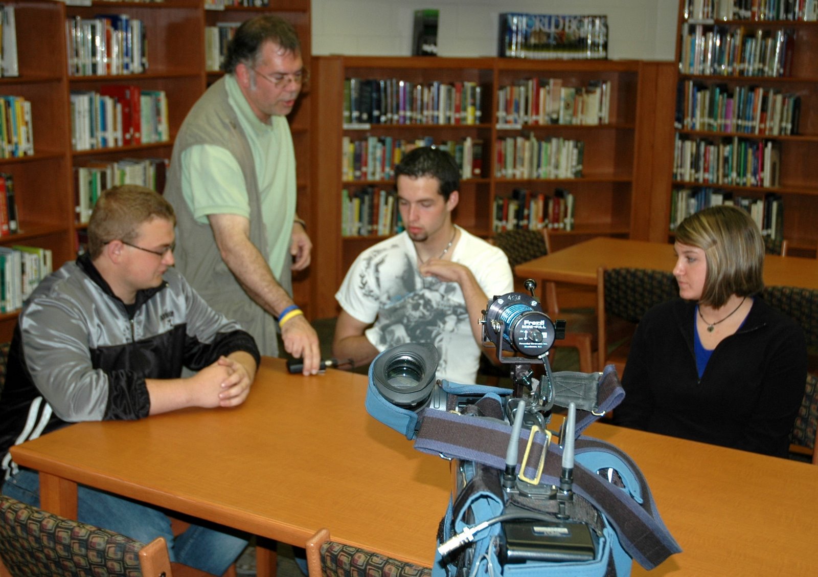 (Top photo is the Channel 5 interview in the Media Center and the bottom photo is the Channel 12 interview in the cafeteria)
