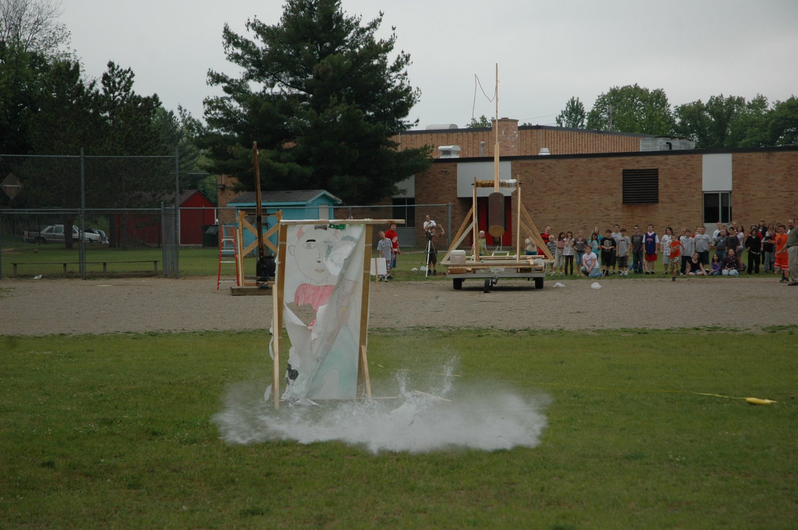 At the Thursday assembly students from all the classes gathered on the athletic field to watch and see which of the two catapults would prove to be more accurate.