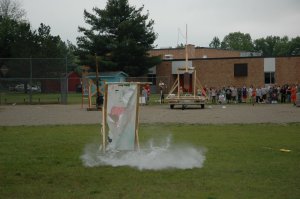A two-month science project culminated Thursday afternoon, May 28th, when the 5th grade class of Mr. Robert Losinger and the 6th grade class of Mr. Joshua Back faced off on the athletic field with Trebuchets (catapults) built by students.