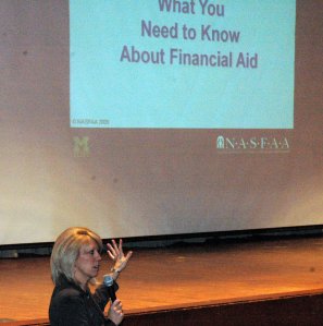 About 100 parents and students attended a Financial Aid Workshop presented by Ms. Lori Vedder, Director of Financial Aid at the University of Michigan-Flint Tuesday night, January 19, 2010 in the Lapeer East High School Auditorium. Ms. Vedder is at the far left, an associate from UM-Flint is in the center and Mrs. Susan Wilmers introduced the two women at the opening of the session.
