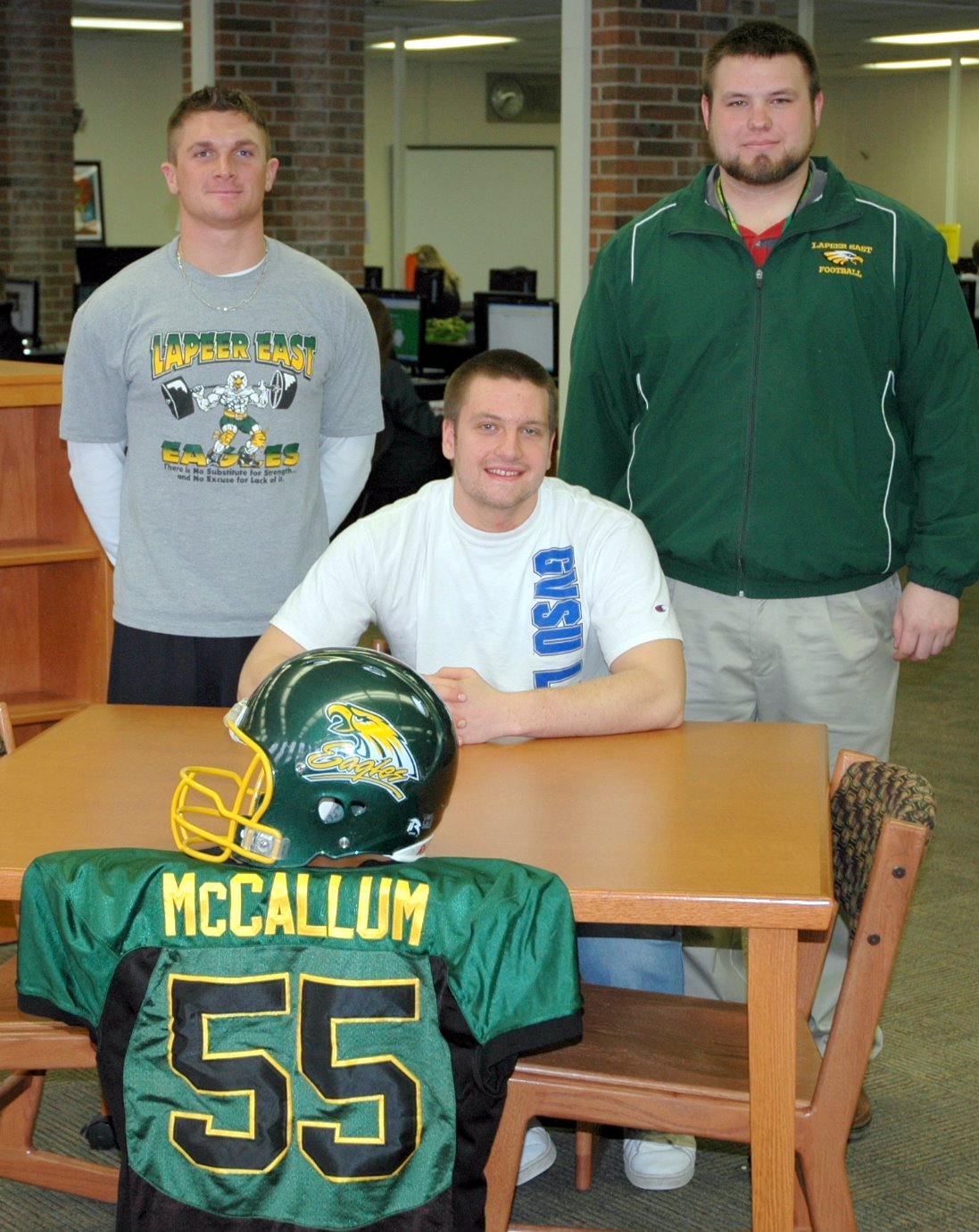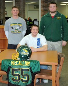 Photo caption (left to right) East varsity head coach Jake Weingartz, Payton McCallum, Joe Hensel, varsity football assistant defensive coordinator coach.