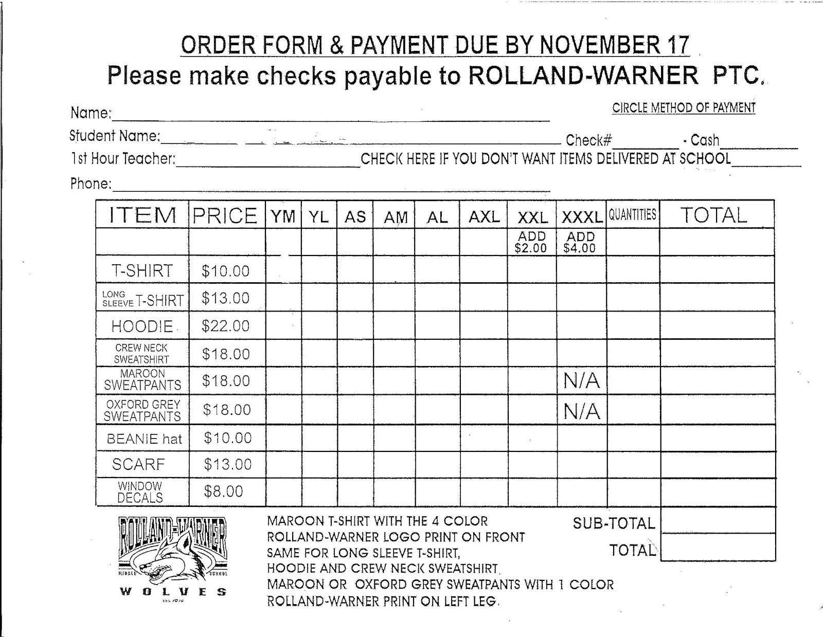 This is the final week to place orders for Rolland-Warner Wolves hats, shirts, scarves and sweatpants.