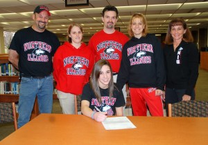 Amanda Stepp (seated) signed her national letter of intent to attend Northern Illinois University Monday surrounded by (from left) her father, Mike Stepp, coaches Sarah Morgan, Joe and Melinda Scheible and mother Robin Stepp.