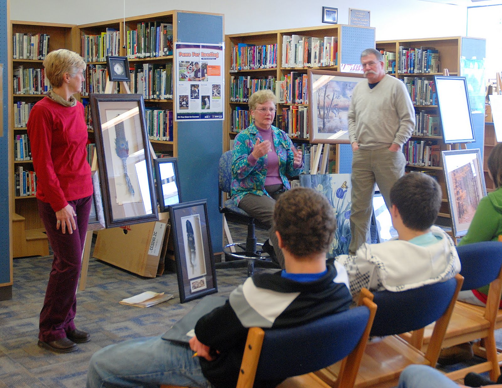 Artists Deb Keene and RuthAnn Mersino, and photographer Dale Vronch spoke to students in the Lapeer West library.