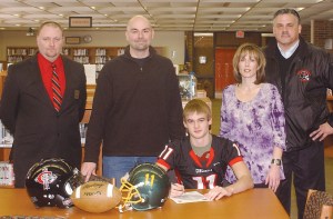 Lapeer East senior Jacob Burke signs his letter of intent with Concordia University as he is surrounded by his parents and Concordia coaches.