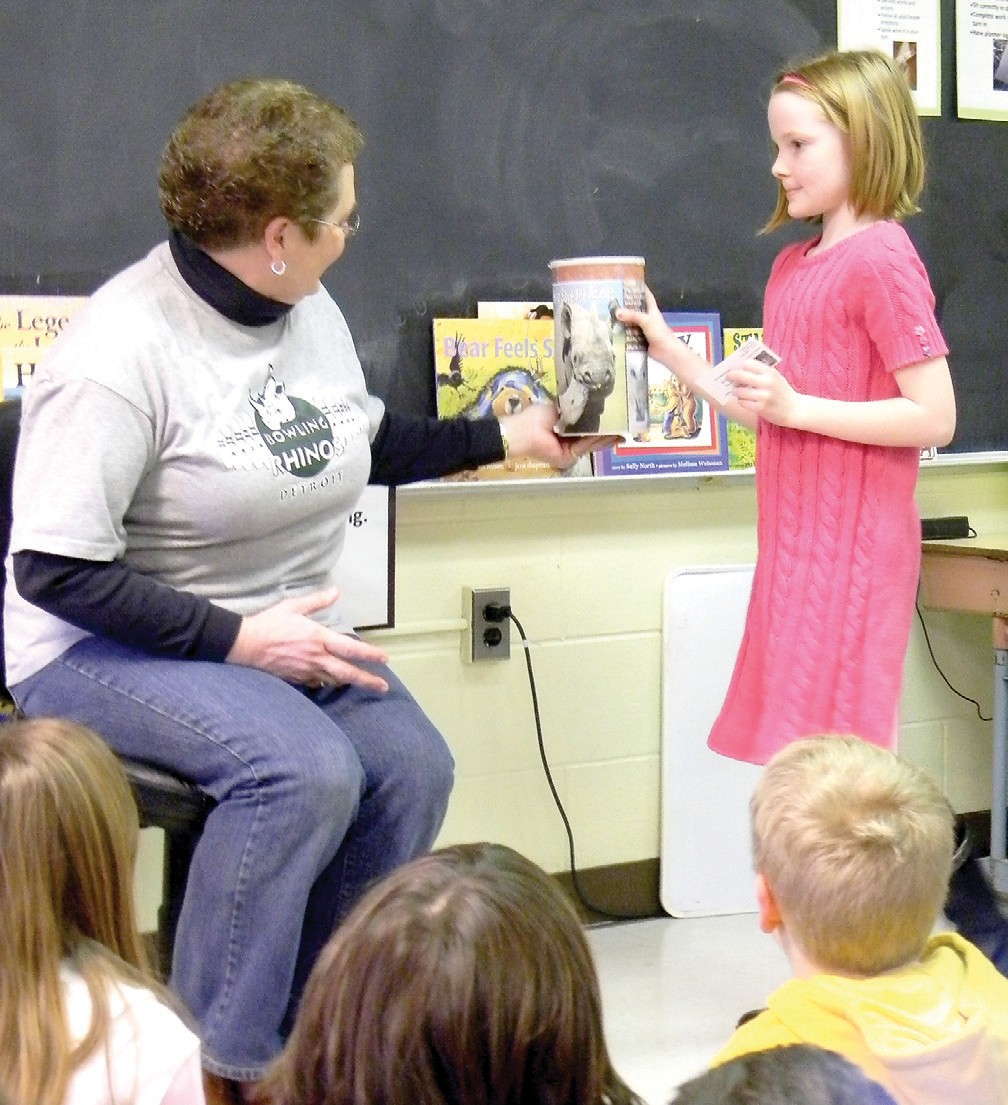 Ruth Ann Prey, a retired school teacher, Monday morning (March 14). The money, raised entirely by the students, will be sent to an animal sanctuary in Africa that helps rescue endangered black rhinoceroses.