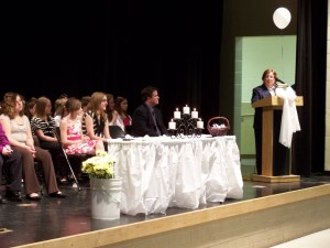 Superintendent Debbie Thompson, for whom the Zemmer Middle School’s new National Junior Honor Society chapter is named, addressed the 2010-2011 inductees at a ceremony Tuesday evening.