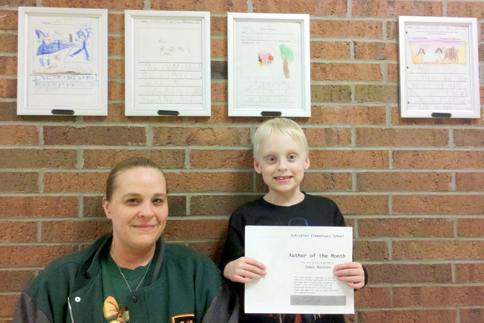 Schickler Kindergarten student, James Racknor, celebrates his author of the month award by posing for a picture with his mother Tamara Racknor. James and his family are very proud of the award and James’s writing.