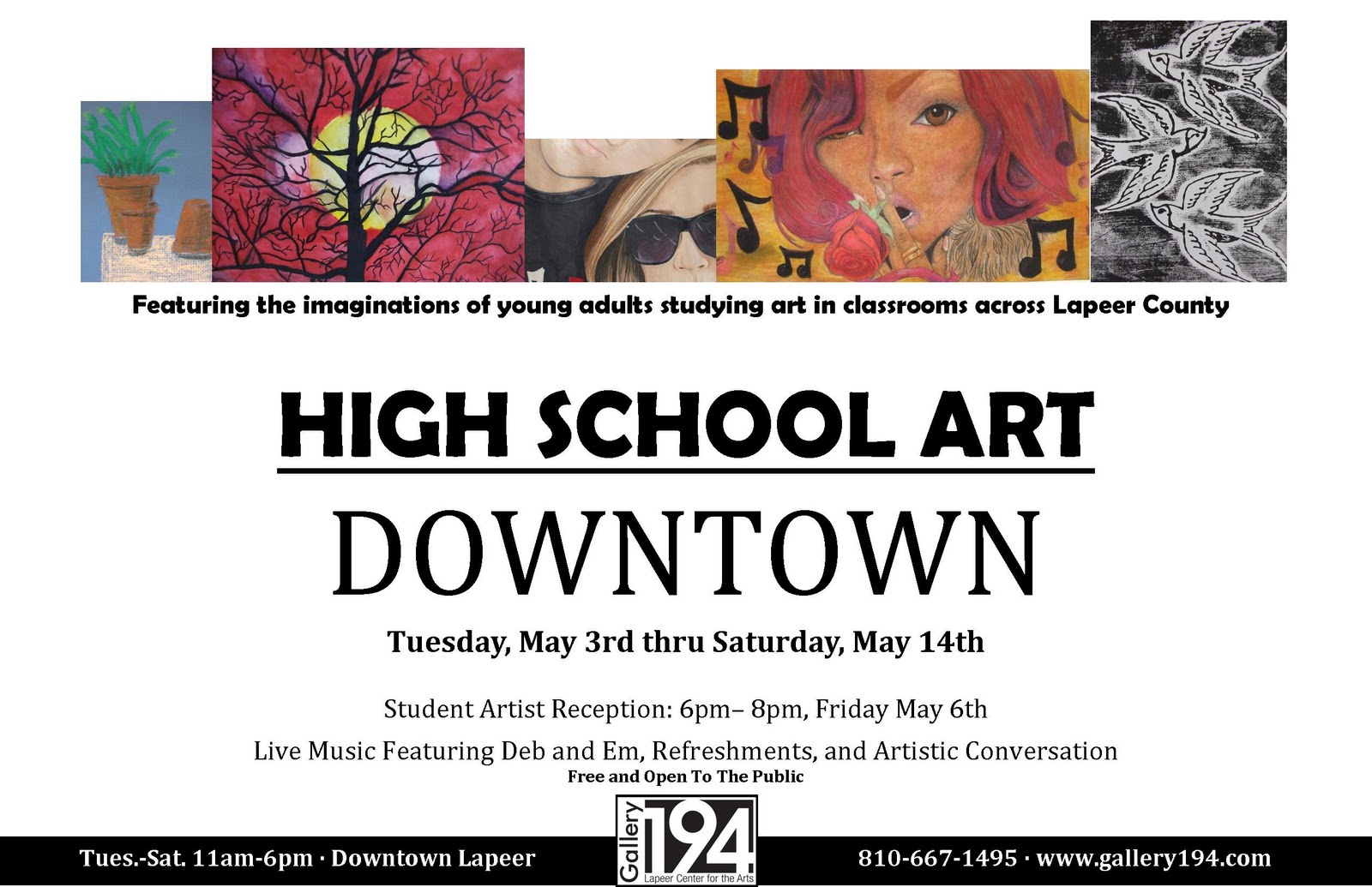 High School Art Downtown is featured at Gallery 194 in downtown Lapeer through May 14th displaying work of students engaged in studying art from Lapeer, North Branch, Almont and home school programs. On Friday, May 6, from 6 p.m. to 8 p.m. student artists will be on hand for a free opening with live music by Deb & Em, food and artistic conversation. The public is encouraged to venture to downtown Lapeer and enjoy the experience.