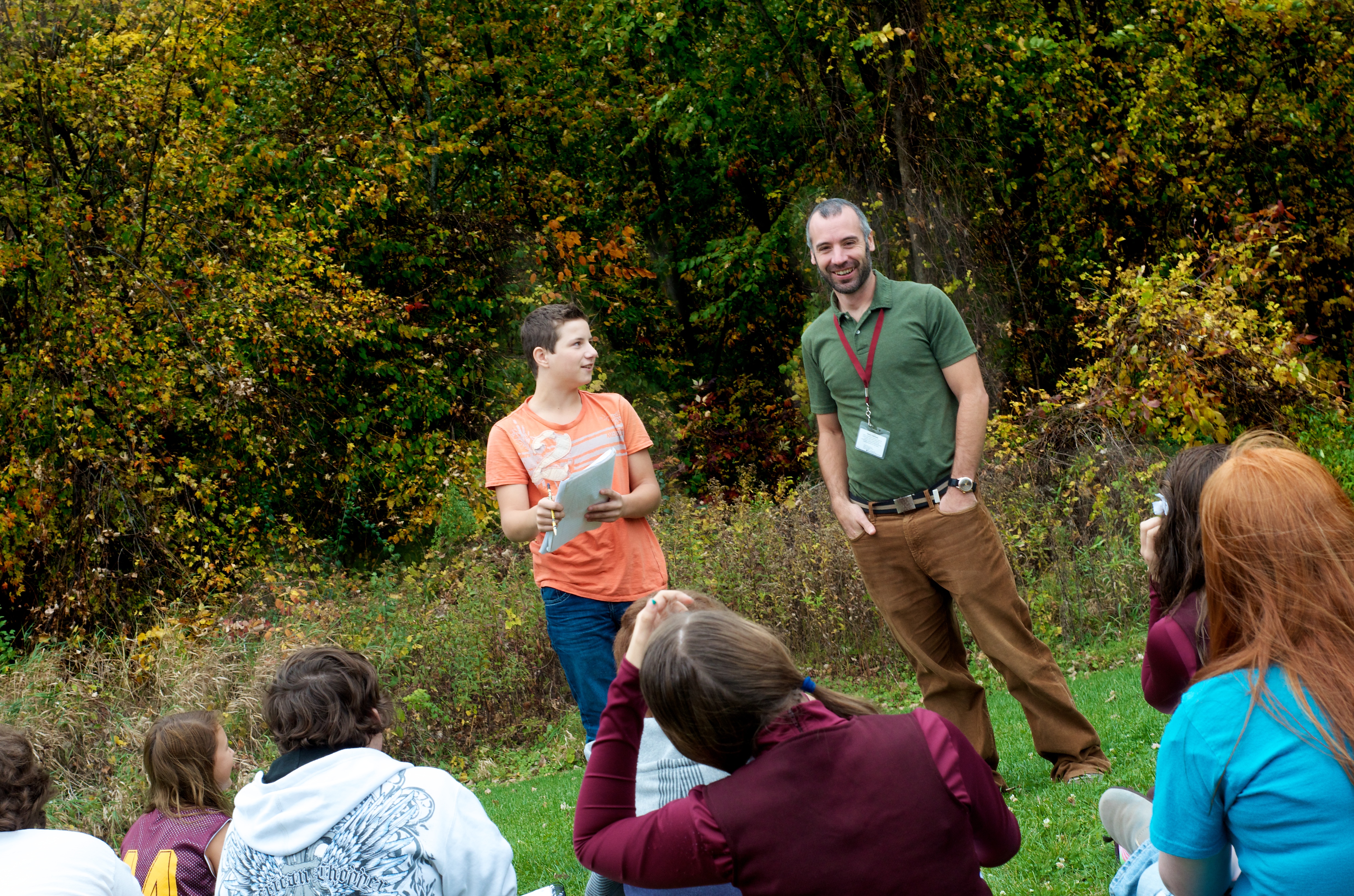 Mr. Sweeney’s eighth grade English class sprawled out on the lawn at Rolland-Warner Middle School on Wednesday afternoon, armed with notepads, pencils and all five senses. The students were instructed to focus all their attention on the world around them and to translate their experience into words.