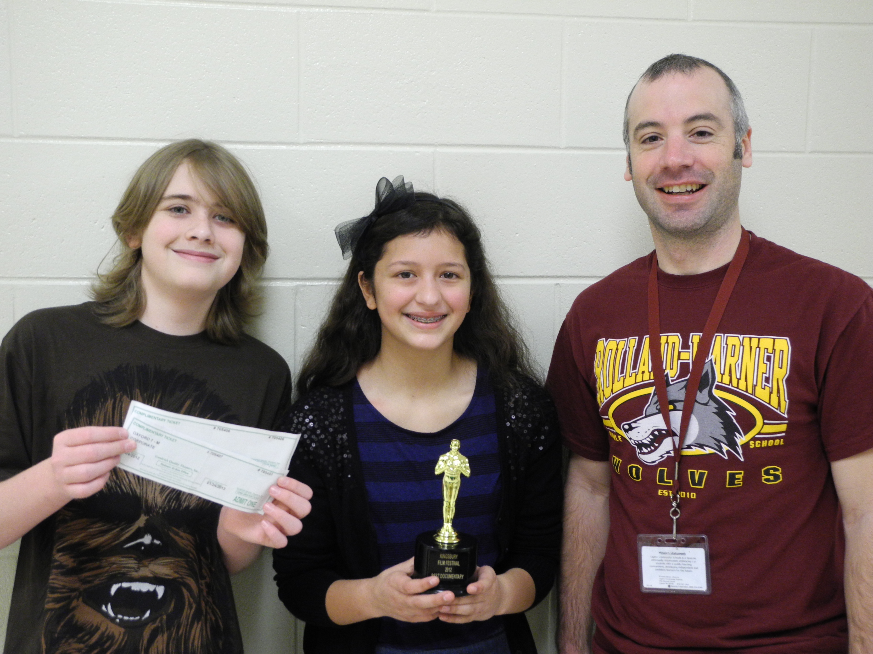 Rolland-Warner students Connor LaFerre and Marissa Pruitt, pictured with their teacher, Mr. Sweeney. The two students recently received a trophy for their short documentary on heroism that was entered into a film festival in Oakland County.