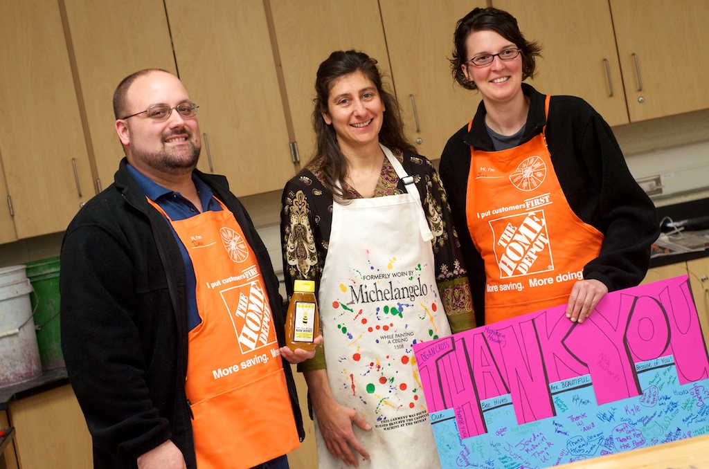 Home Depot donated the supplies used to paint the club’s hives. Jill Duhl and Daniel Kennedy, representing Team Depot, received a large “Thank You” sign and their own bottle of Rolland-Warner-made honey.