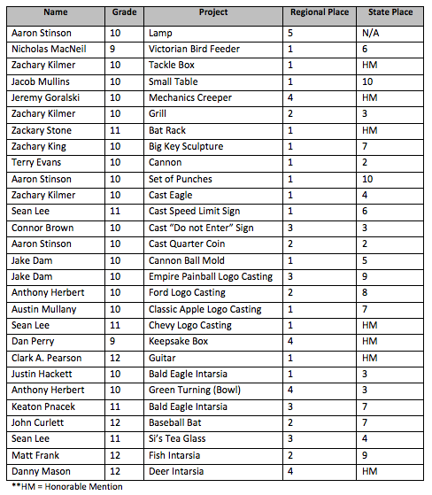 Here are the results of the Michigan Industrial & Technology Education Society Competition , both regional and state, from Lapeer East. If you know any of these students, please congratulate them on jobs well done. Many of the projects listed are on display in showcase #19, across from the metal shop at Lapeer East.