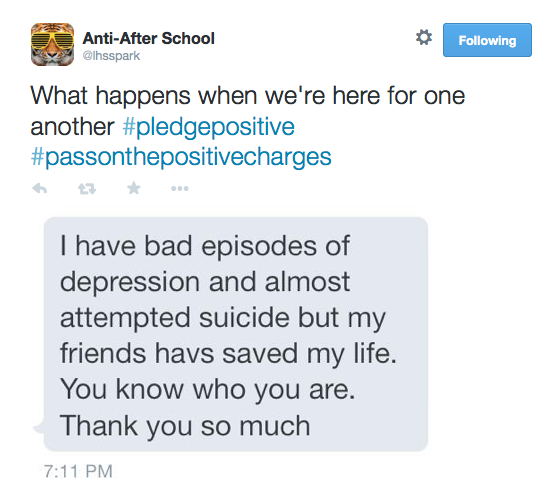 Fortunately, two students decided not be bystanders to this negative cycle. @lhsspark is a positive twitter account that allows followers to send positive (mostly anonymous) messages out on twitter about LHS, students, and society in general. This account has already garnered a following of over 230 people, and is a positive force within our local Twitterverse.