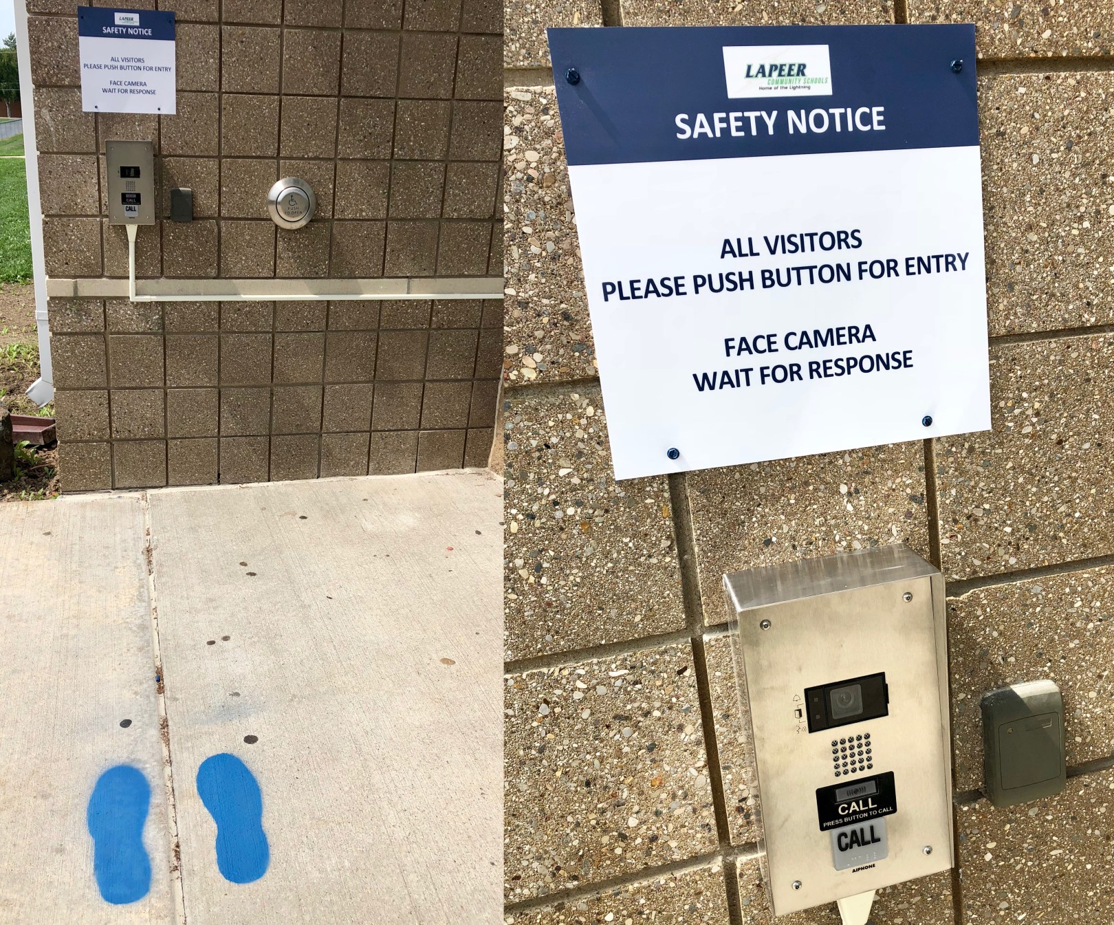 Once school starts, the main entry door is locked. At that point, all visitors must request entry by pushing the call button and standing on the footprints to be visible (by camera) to a member of the office staff. Once the call is answered in the office, the prospective visitor will be asked for their name and the purpose of their visit. Once the visitor is deemed safe for entry, the door will be unlocked.