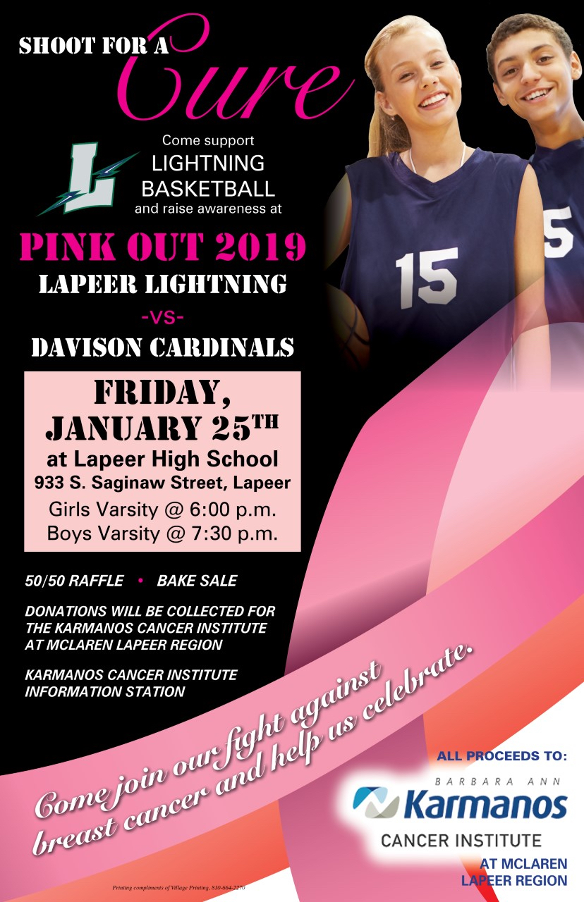 The annual Shoot for a Cure event to support the Barbara Ann Karmanos Cancer Institute will be held on January 25, 2019 at the Lapeer High School Gymnasium. Our varsity girls’ basketball team will take the floor starting at 6 p.m. and the boys’ varsity will follow at 7:30 p.m.