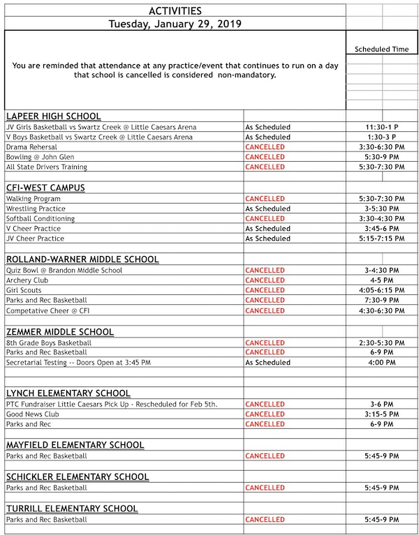 Schedule of Evening Activities for Jan. 29, 2019 January 29, 2019January 29, 2019 by The Bolt Please see the following schedule for evening activities for Jan. 29, 2019. Student participation in events or activities on canceled school days is not mandatory. Share this: Click to share on X (Opens in new window) X Click to share on Facebook (Opens in new window) Facebook Click to email a link to a friend (Opens in new window) Email Click to print (Opens in new window) Print Like Loading... The Bolt Leave a comment Cancel reply Δ