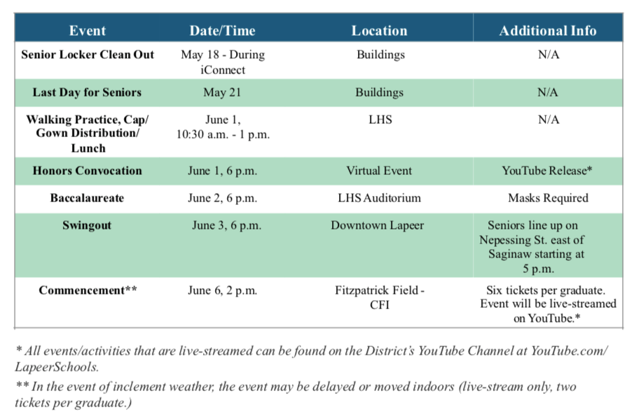 • The Class of 2021 Commencement will be held, as planned, outdoors at Fitzpatrick Field (CFI-West Campus) starting at 2 p.m. on June 6. Parents of seniors will be allowed six tickets. In the event of inclement weather, the commencement will be moved to the gym at Lapeer High School, with each graduate receiving two tickets. The event will be live-streamed on the District’s YouTube Channel (YouTube.com/LapeerSchools)