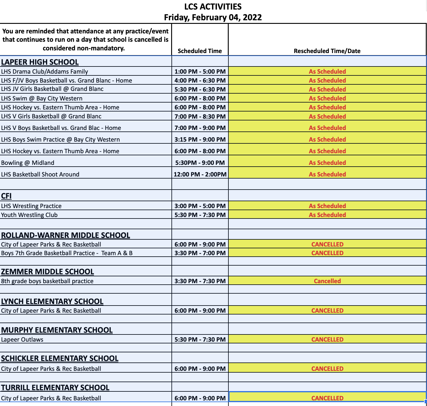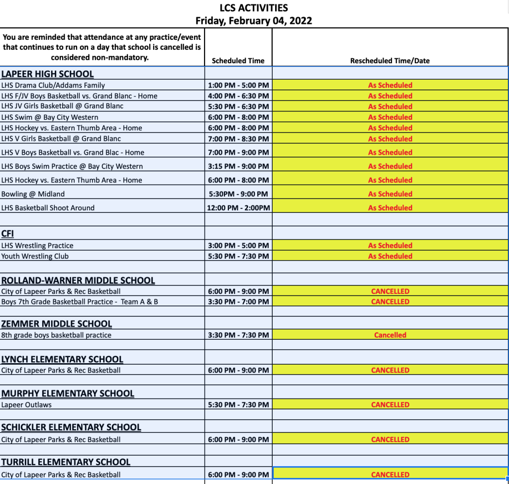 February 4, 2022: Schedule of Evening Activities February 4, 2022 by The Bolt Please see the following list of evening activities for February 4, 2022. As a reminder, attendance at any practice/event held on a cancelled school day is not mandatory. Share this: Click to share on X (Opens in new window) X Click to share on Facebook (Opens in new window) Facebook Click to email a link to a friend (Opens in new window) Email Click to print (Opens in new window) Print Like Loading... The Bolt Leave a comment Cancel reply Δ