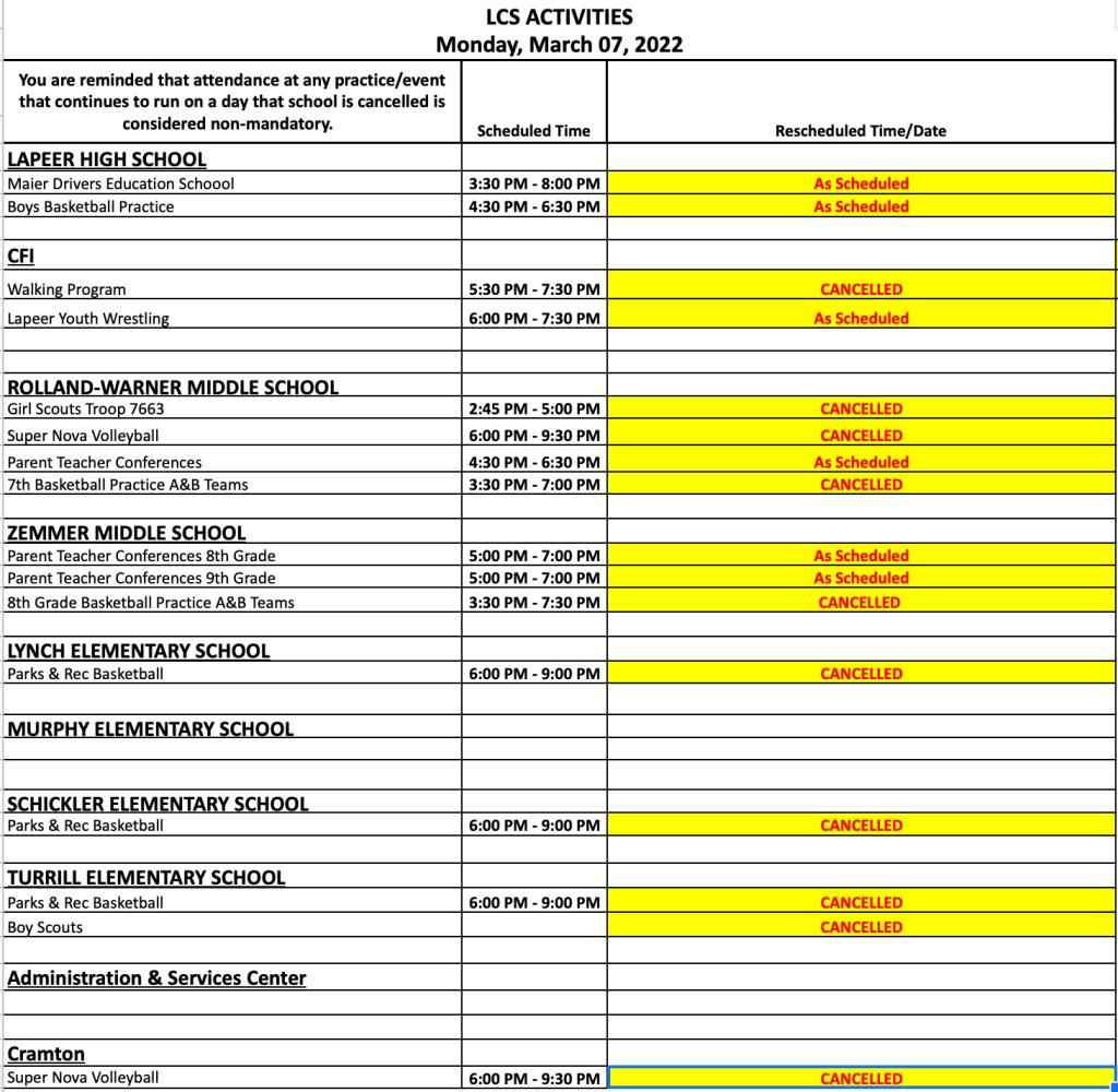 Please see the following list of evening activities for Monday, March 7, 2022. Notably, parent-teacher conferences are still running as scheduled for this evening. As always, attendance at any activity scheduled on a cancelled school day is not mandatory.