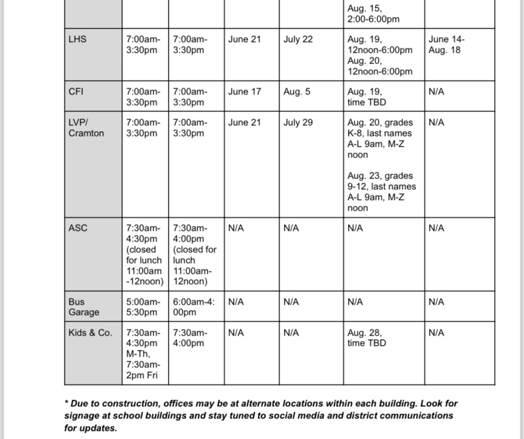 We also have our open houses/registration dates set for all buildings. As noted in the schedule, our elementary buildings are hosting open houses after the first day of school due to the construction timeline. We realize this may create some anxiety for our first-time families, but individual buildings will be communicating over the summer to provide relevant and timely information about what to expect on those first few days of school.