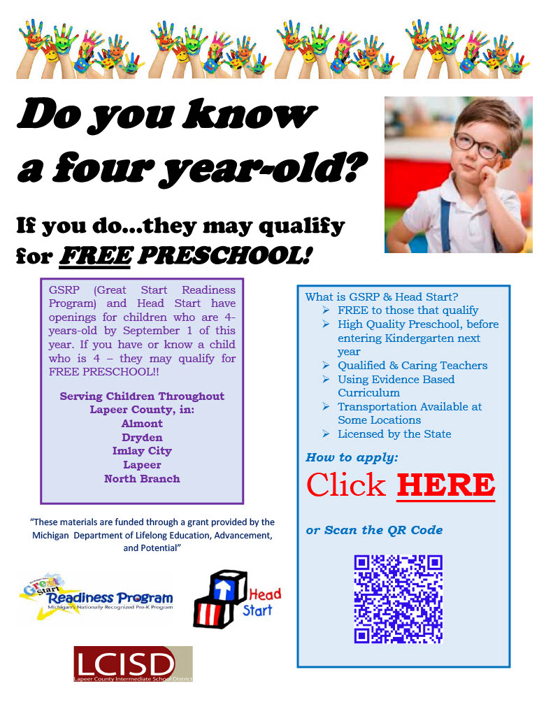 GSRP (Great Start Readiness Program) and Head Start have openings for children who are 4 years old by September 1 of this year.